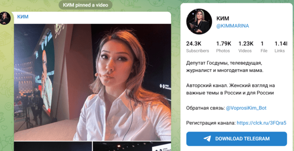 마리나 김은 이미 우크라이나 전쟁 관련 러시아 선전물을 적극적으로 유포했다는 이유로 유럽연합(EU)와 우크라이나 제재 명단에 올라 있다. 그녀는 한국인 아버지와 러시아인 어머니 사이에서 태어난 고려인 3세로, 국내에서 개최된 한러포럼 참석차 한국을 방문한 것으로 알려졌다.