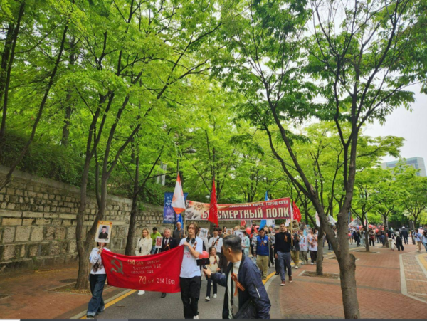 주한러시아 대사관에 따르면 6일 서울 종로구 일원(주한러시아 대사관과 정동길, 광화문)에서 진행된 80주년 기념 '불멸의 연대' 행진에는 국내 체류 러시아인들과 초청 인사 등 500여명이 참석해 성황을 이뤘다. 트럼프 미 대통령 주도의 휴전(종전) 분위기에도 영향을 받은 것으로 보인다.