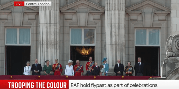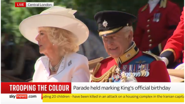 영국 스카이 뉴스가 생중계한 이날 퍼레이드에는 1,300명이 넘는 군인들이 참가했다. 전통에 따라 마차를 타고 현장에 도착한 찰스 3세는 최근 인도에서 발생한 비행기 추락 사고로 사망한 영국인 50명을 추모하는 묵념을 제안했고, 왕실 고위 인사들은 모두 검은색 추모 완장을 차고 참석했다. 키어 스타머 총리 부부도 카메라에 잡혔다.