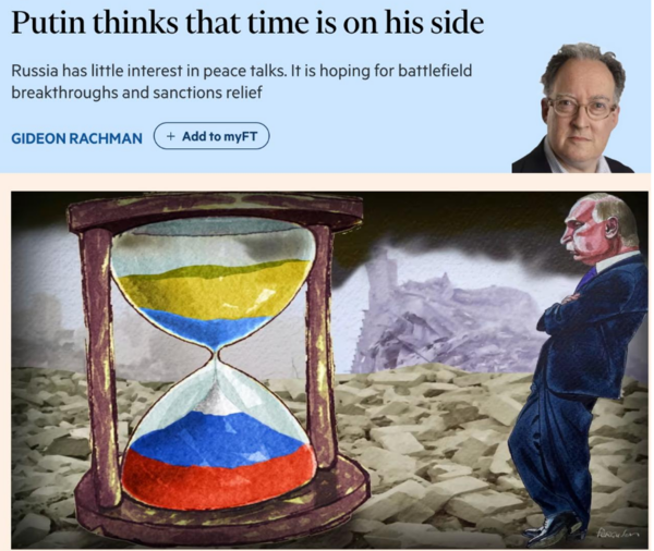 유럽의 노림수는 분명하다. 우크라이나 전쟁의 장기화는 자신들에게 이롭다고 여긴다. 러시아가 손쉽게 승리할(휴전 조건 달성) 경우, 자신들이 다음 타깃이 될 수 있다고 우려하는 것이다. 프리드리히 메르츠 독일 총리가 8일 의회에서 예산 협의 도중 "우크라이나 갈등 해결을 위한 외교적 수단은 고갈됐다"고 주장한 것은 결코 우연이 아니라는 분석도 있다. 러시아와 우크라이나가 오래도록 싸워 양패구상(兩敗俱傷)으로 끝나기를 바라는 격이다.