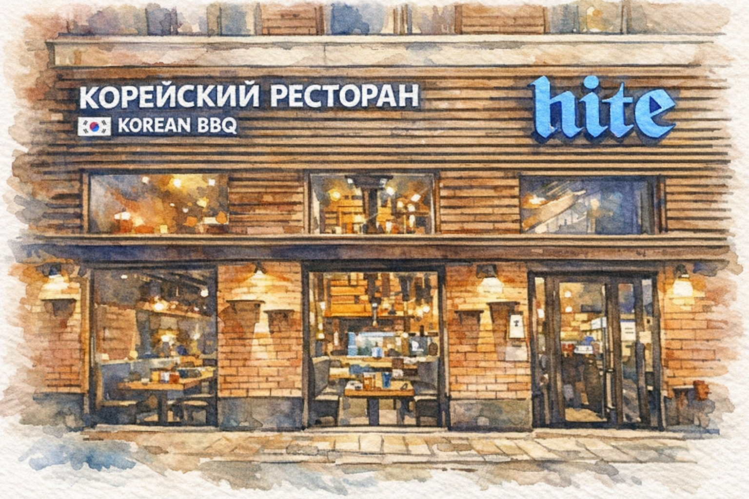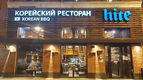 모스크바에는 ‘한국 음식점’이라는 간판을 단 곳이 꽤 있다. 그런데 막상 문을 열고 들어가면 한국식이라기보다 “한국 느낌이 아주 살짝 스친 아시아 레스토랑”인 경우도 많다. HITE는 다르다. 여기서는 애매한 척을 하지 않는다. 입구에서부터 “КОРЕЙСКИЙ РЕСТОРАН / KOREAN BBQ”라고 크게 선언하고, 오른쪽에 푸른빛 ‘hite’ 로고를 박아놓는다. 번역하면 이런 뜻이다. “들어오면 고기 굽게 될 거다. 마음의 준비하고 들어와라.”