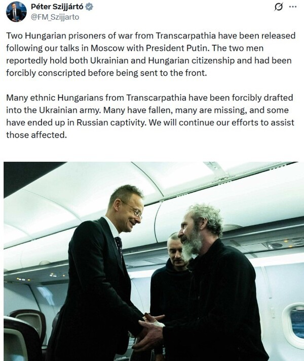 우크라이나 매체 스트라나.ua에 따르면 모스크바를 방문한 페테르 시야르토 헝가리 외무장관이 4일 푸틴 대통령과 만나 헝가리 국적의 우크라이나 전쟁 포로 두 명의 석방 허가를 받아내고, 그들의 사진을 공개했다. 시야르토 장관은 SNS(페이스북)에 "푸틴 대통령과 회담 이후 트란스카르파티아 출신의 헝가리 전쟁 포로 두 명이 석방됐다"며 "두 사람 모두 우크라이나와 헝가리 이중 국적자로, 강제로 징집돼 전쟁터로 보내졌다"고 썼다.