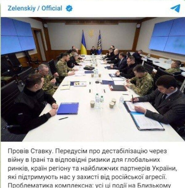 그로부터 열흘 가까이 지난 9일 젤렌스키 대통령은 이란 전쟁에 관한 긴급 대책회의를 주재했다. 그는 텔레그램에 쓴 글에서 "'세계 시장, 우크라이나 및 그 파트너 국가에 대한 위험'을 주제로 회의를 열었다"며 "이란 전쟁이 우크라이나와 세계 여러 지역, 우크라이나에 대한 필수 물자 공급, 그리고 우리 국민의 안보와 복지에 직접적인 영향을 미치고 있다"고 썼다. 또 내외신 인터뷰에서 "패트리어트 미사일에 대한 중동 지역의 막대한 수요가 우크라이나에 대한 미사일 공급을 위협한다"고 우려했다.