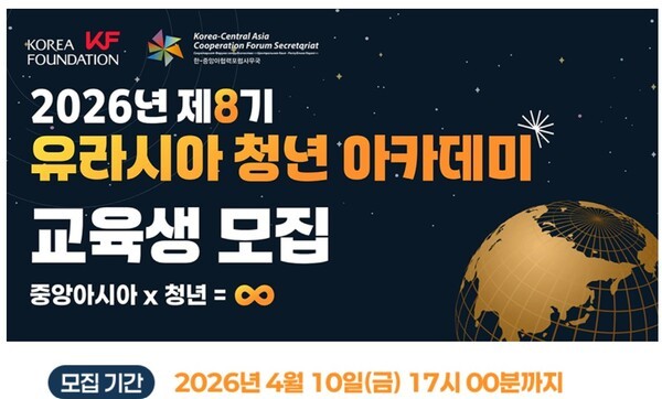 한국국제교류재단은 중앙아시아 진출을 꿈꾸는 청년들을 위해 '2026 유라시아 청년 아카데미 8기' 참가자를 모집한다. 마감은 내달 (4월) 10일까지.