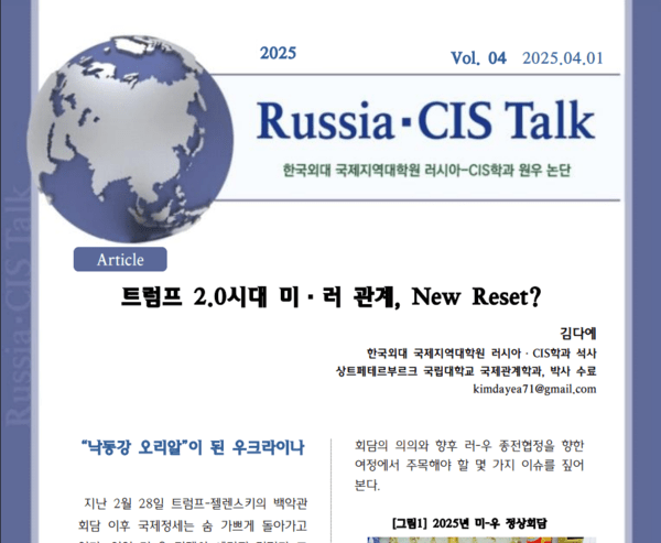 한국외대 국제지역대학원 러시아-CIS 학과가 발간하는 월간 '러시아CIS 토크' (Russia-CIS Talk)는 2025년 4월호(2025년 4월 1일자, https://ruscis.hufs.ac.kr)에서 4년 만에 백악관으로 돌아온 트럼프 미 대통령이 추진하는 러시아와의 관계 재정립이 어떤 형식으로 진행되고, 또 의미를 갖고 있는지 분석했다. 김다예씨(상트페테르부르크 국립대학 국제관계학과 박사 수료)가 쓴 '트럼프 2.0 시대 미-러 관계, New Reset?'이다. 소개한다/편집자