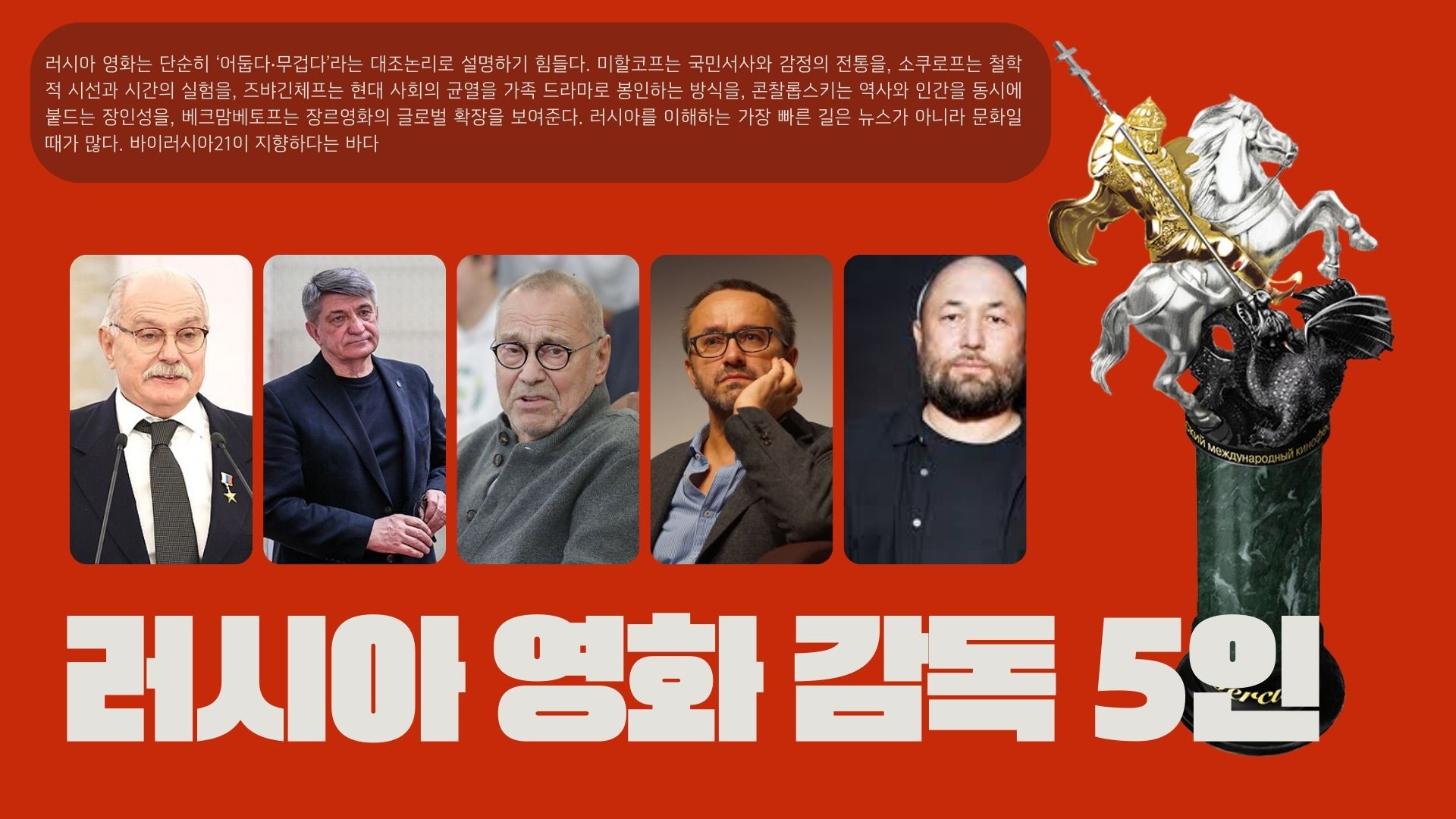 같은 러시아이면서 다른 러시아 이렇게, 다섯 명의 영화를 한 번에 훑으면, 러시아 영화가 단순히 ‘어둡다‧무겁다’라는 대조논리로써 해석 한계가 있음을 알 수 있다. 미할코프는 국민서사와 감정의 전통을, 소쿠로프는 철학적 시선과 시간의 실험을, 즈뱌긴체프는 현대 사회의 균열을 가족 드라마로 봉인하는 방식을, 콘찰롭스키는 역사와 인간을 동시에 붙드는 장인성을, 베크맘베토프는 장르영화의 글로벌 확장을 보여준다. 러시아를 이해하는 가장 빠른 길은 뉴스가 아니라 문화일 때가 많다. 바이러시아21이 지향하다는 바다. 이 5명의 필모그래피와 그들의 영화는 그 ‘문화 지도’를 펼쳐보는 도구가 된다.